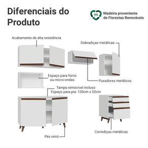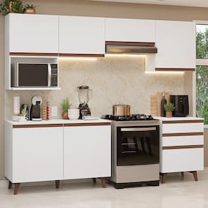 As dobradiças e corrediças metálicas proporcionam resistência no uso diário. O acabamento Branco de alta resistência oferece sofisticação, enquanto os armários e balcões garantem espaço amplo para você organizar tudo que precisa.