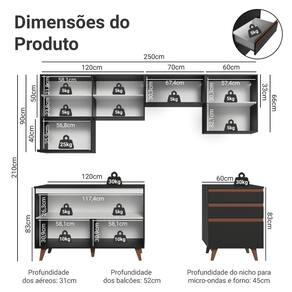 - 31 cm de profundidade nos aéreos, 52 cm nos balcões e 45 cm no nicho para micro-ondas