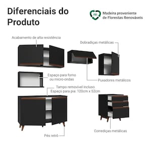 As dobradiças e corrediças metálicas proporcionam resistência no uso diário. O acabamento Preto de alta resistência oferece sofisticação, enquanto os armários e balcões garantem espaço amplo para você organizar tudo que precisa.