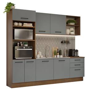 O acabamento da estrutura é em amadeirado Rustic e o das portas e frentes é cinza. É feito em Pintura Poliéster ecológica com sete camadas, que destaca a tonalidade e protege o móvel.