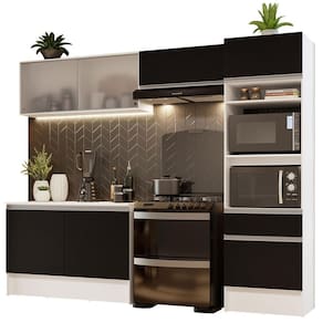 Por fim, o acabamento da estrutura é branco e as portas e frentes são pretas. É feito em Pintura Poliéster ecológica, que consiste na aplicação de sete camadas resistentes a álcool, água e calor.