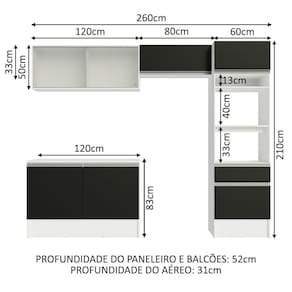 Fabricado com materiais de qualidade, conta com puxadores em perfil total de alumínio, dobradiças e corrediças metálicas, além do aéreo com portas de vidro que agrega beleza e sofisticação ao ambiente.