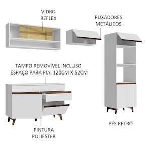 Super espaçosa, esta modulação conta com armários aéreos, balcão e torre quente. Assim, você tem espaço para organizar todas as louças, utensílios e eletros. Além disso, o balcão acompanha tampo, que pode ser removido para colocação de pia de inox ou pedra, no espaço de 120 x 52 cm.