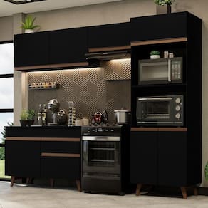 Super espaçosa, esta modulação possui balcão, torre e armários, que oferecem lugar de sobra para a organização de panelas, utensílios, louças, forno, micro-ondas e o que mais você preferir.