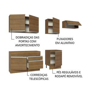 A fabricação é feita com materiais de qualidade, como corrediças telescópicas, puxadores com perfil total em alumínio, dobradiças com amortecimento e pés reguláveis em PVC, com rodapé removível em MDP.