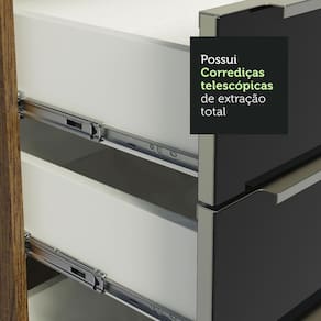 Fabricada com materiais duráveis e de alta qualidade, possui puxadores em alumínio, corrediças telescópicas, amortecedores para o fechamento suave das portas e pistão a gás para a abertura da porta basculante.
