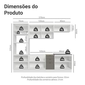Profundidade: 52 cm balcões e 31 cm aéreos