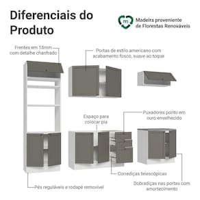O acabamento de alta resistência da estrutura é em Branco e das frentes em Cinza, e possui uma textura suave ao toque, trazendo leveza e sofisticação ao ambiente. O destaque fica por conta dos puxadores ponto em ouro envelhecido, feitos com metal resistente, trazem personalidade e um charme único.