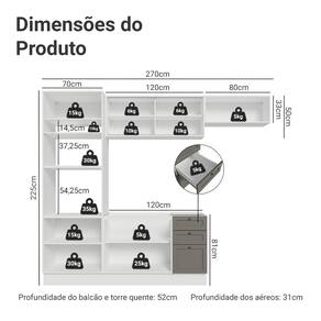 - 52 cm de profundidade nos balcões/nichos e 31cm nos aéreos