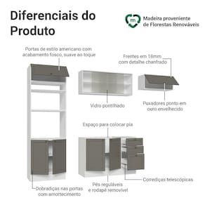 O acabamento de alta resistência da estrutura é em Branco, das frentes em Cinza e possui uma textura suave ao toque. O destaque fica por conta dos puxadores ponto em ouro envelhecido, feitos com metal resistente, trazem personalidade e um charme único. Outro diferencial está no detalhe chanfrado das frentes, que forma molduras elegantes e dá profundidade ao design.