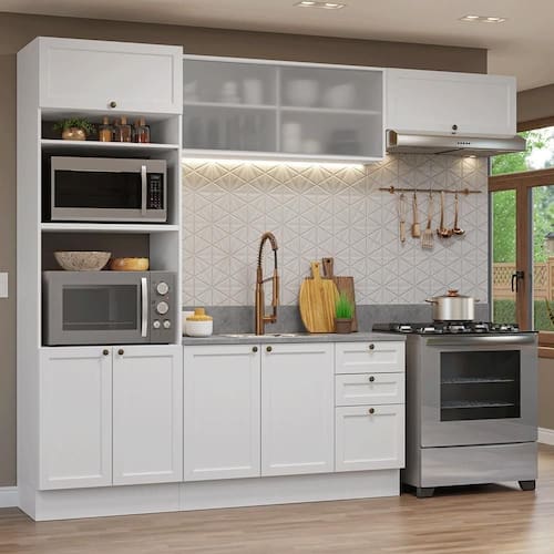 Essa cozinha da Linha Vik foi cuidadosamente projetados. A torre quente com espaço para acomodar eletrodomésticos é o destaque. Outro diferencial é o aéreo com vidro pontilhado que traz um toque moderno a cozinha.