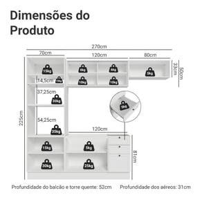 - 52 cm de profundidade nos balcões/nichos e 31cm nos aéreos