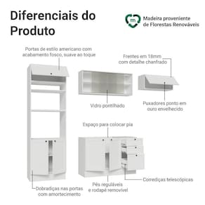 O acabamento de alta resistência da estrutura e das frentes é em Branco e possui uma textura suave ao toque. O destaque fica por conta dos puxadores ponto em ouro envelhecido, feitos com metal resistente, trazem personalidade e um charme único. Outro diferencial está no detalhe chanfrado das frentes, que forma molduras elegantes e dá profundidade ao design.