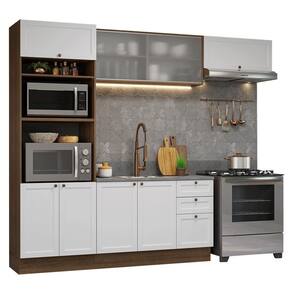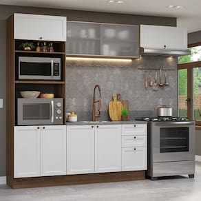 Essa cozinha da Linha Vik foi cuidadosamente projetados. A torre quente com espaço para acomodar eletrodomésticos é o destaque. Outro diferencial é o aéreo com vidro pontilhado que traz um toque moderno a cozinha.