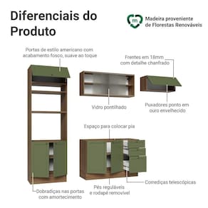 O acabamento de alta resistência da estrutura é em tom amadeirado Rustic, das frentes em Verde e possui uma textura suave ao toque. O destaque fica por conta dos puxadores ponto em ouro envelhecido, feitos com metal resistente, trazem personalidade e um charme único. Outro diferencial está no detalhe chanfrado das frentes, que forma molduras elegantes e dá profundidade ao design.