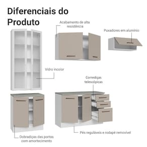 O móvel se destaca pelos puxadores com alça em alumínio e gavetas com corrediças telescópicas de abertura total. Possui ainda portas com amortecimento para fechamento suave e pés reguláveis em PVC.