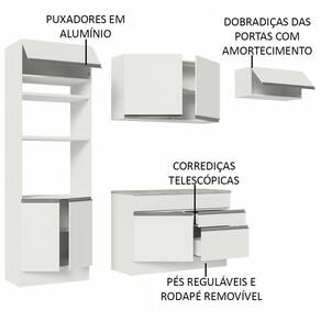 Fabricada com itens de qualidade superior, possui puxadores em alumínio, corrediças telescópicas na gaveta, amortecedores para fechamento suave das portas e pistão a gás na porta basculante. Além disso, conta com pés reguláveis em PVC e rodapé removível em MDP.