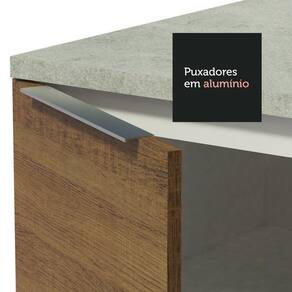 Possui puxadores slim em alumínio, gavetas com corrediças telescópicas, portas com amortecimento para fechamento suave. Além disso, os pés são reguláveis em PVC, com rodapé removível de MDP.