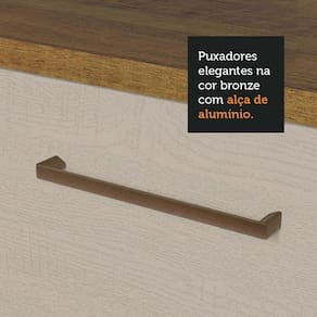 Fabricada com alto padrão de qualidade, possui puxadores com alça em alumínio, gavetas com corrediças telescópicas de abertura total, vidros reflex no aéreo e as portas com amortecimento para fechamento suave e pés em PVC com ajuste de altura, com rodapé removível em MDP