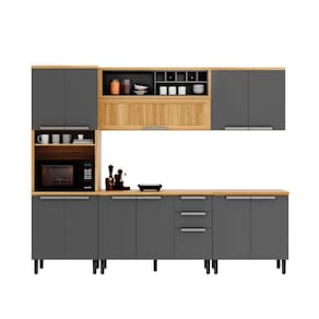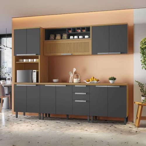 Com 270cm de largura, a composição é versátil e bem distribuída. Inclui: Um paneleiro com uma porta e espaço para forno ou micro-ondas de até 70cm de largura, ideal para integrar eletrodomésticos ao projeto de forma prática.