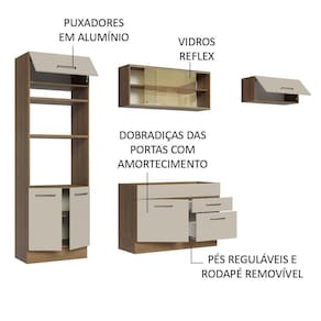 Fabricada com alto padrão de qualidade, possui puxadores com alça em alumínio, gavetas com corrediças telescópicas de abertura total, vidros reflex no aéreo e as portas com amortecimento para fechamento suave e pés em PVC com ajuste de altura, com rodapé removível em MDP