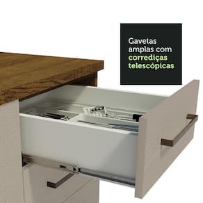 O acabamento da estrutura é em amadeirado Rustic e o das portas e frentes é na coloração Crema. É feito em Pintura Poliéster com 7 camadas que protegem o móvel dos efeitos da água e do calor.