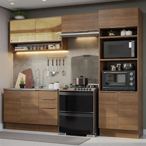 O espaço disponível é perfeito para armazenar utensílios, panelas, eletroportáteis, forno, micro-ondas e muito mais. Assim, você tem um ambiente funcional e organizado.