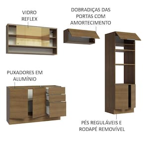 Possui puxadores em alumínio, corrediças telescópicas que permitem a abertura total das gavetas e portas equipadas com amortecedores que proporcionam um fechamento suave. Além disso, conta com pés reguláveis em PVC e rodapé removível em MDP.