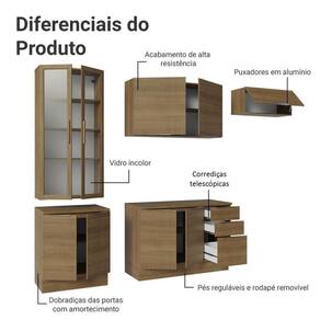 Outros diferenciais deste móvel são os puxadores em alumínio e as gavetas com corrediças telescópicas de abertura total. Possui ainda portas com amortecimento para fechamento suave e pés reguláveis em PVC.