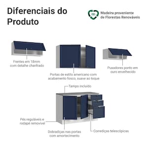 Além disso, a linha Vik é funcional em cada detalhe. As portas possuem dobradiças com amortecimento, garantindo um fechamento suave e silencioso, enquanto as gavetas permitem abertura total, garantindo muito mais facilidade. O acabamento de alta resistência da estrutura é na cor Branca e das frentes em Azul e possui uma textura suave ao toque. O destaque fica por conta dos puxadores ponto em ouro envelhecido, feitos com metal resistente, trazem personalidade e um charme único.