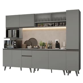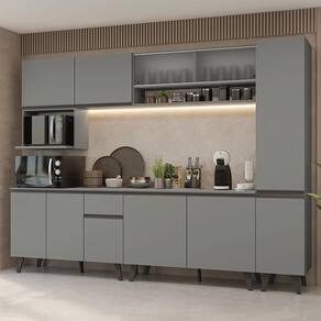 O acabamento cinza, uma tonalidade sofisticada e atemporal, transmite modernidade, adaptando-se a diferentes estilos de decoração. Os puxadores e os pés na coloração titanium são detalhes que valorizam o design.