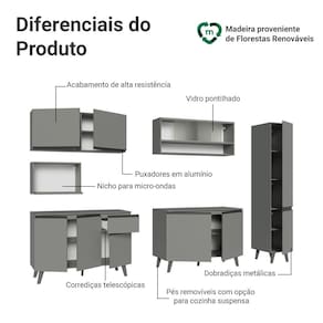 Produzido com materiais de qualidade, o balcão conta com dobradiças metálicas nas portas e puxadores em perfil de alumínio, discretos e resistentes. O tampo é removível, o que permite a instalação de cuba ou pedra. O acabamento é de alta resistência, garantindo durabilidade.