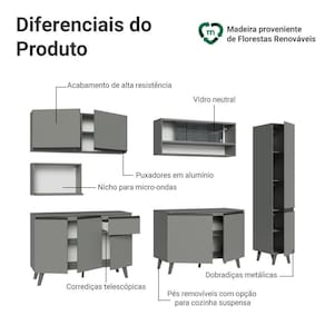 Produzido com materiais de qualidade, o balcão conta com dobradiças metálicas nas portas e puxadores em perfil de alumínio, discretos e resistentes. O tampo é removível, o que permite a instalação de cuba ou pedra. O acabamento é de alta resistência, garantindo durabilidade.