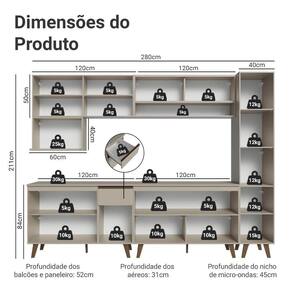 - 52 cm de profundidade nos balcões e paneleiro, 31 cm nos aéreos e 45 cm no nicho para micro-ondas