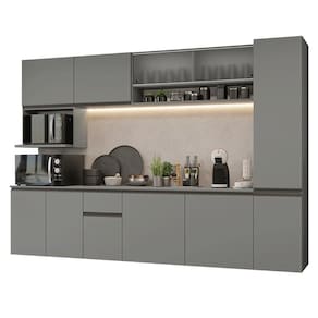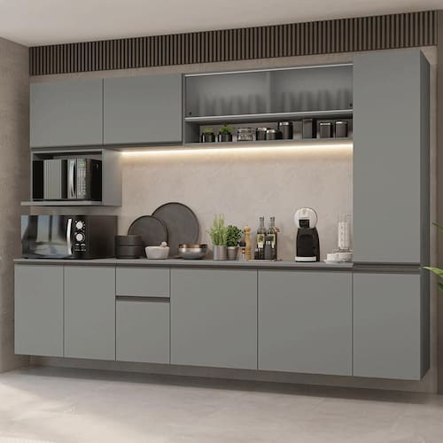 O acabamento cinza, uma tonalidade sofisticada e atemporal, transmite modernidade, adaptando-se a diferentes estilos de decoração. Os puxadores na coloração titanium são detalhes que valorizam o design trazendo um toque contemporâneo.