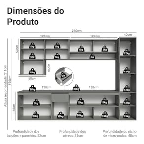 - 52 cm de profundidade nos balcões e paneleiro, 31 cm nos aéreos e 45 cm no nicho para micro-ondas