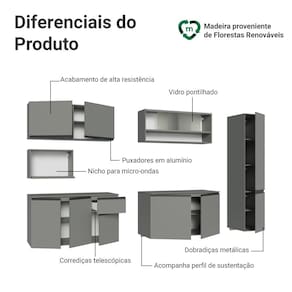O balcão conta com dobradiças metálicas nas portas e puxadores em perfil de alumínio, discretos e resistentes. O tampo é removível, o que permite a instalação de cuba ou pedra. O acabamento é de alta resistência, garantindo durabilidade.