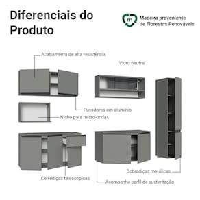O balcão conta com dobradiças metálicas nas portas e puxadores em perfil de alumínio, discretos e resistentes. O tampo é removível, o que permite a instalação de cuba ou pedra. O acabamento é de alta resistência, garantindo durabilidade.