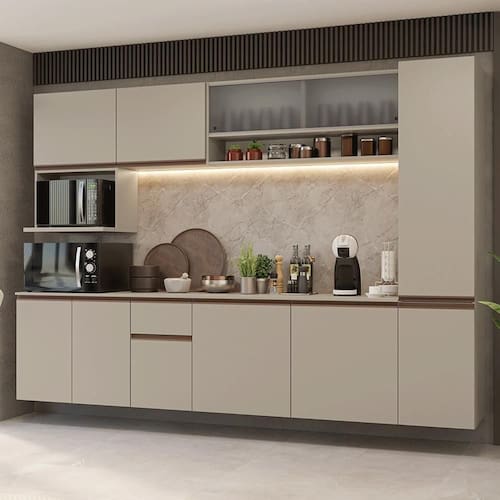 A linha Nice chega em uma nova versão no tom crema, uma tonalidade suave que transmite aconchego e leveza. Outro diferencial está nos puxadores em bronze metalizado, que acrescentam um toque contemporâneo. Com a opção de ser instalada de forma suspensa, essa cozinha oferece um visual ainda mais moderno.