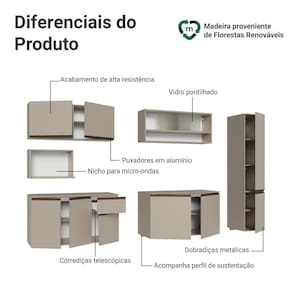 O balcão conta com dobradiças metálicas nas portas e puxadores em perfil de alumínio, discretos e resistentes. O tampo é removível, o que permite a instalação de cuba ou pedra. O acabamento é de alta resistência, garantindo durabilidade.