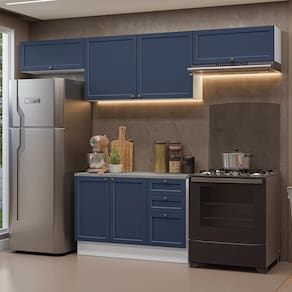 Além disso, a linha Vik é funcional em cada detalhe. As portas possuem dobradiças com amortecimento, garantindo um fechamento suave e silencioso, enquanto as gavetas permitem abertura total, garantindo muito mais facilidade. O acabamento de alta resistência da estrutura é na cor Branca e das frentes em Azul e possui uma textura suave ao toque. O destaque fica por conta dos puxadores ponto em ouro envelhecido, feitos com metal resistente, trazem personalidade e um charme único.