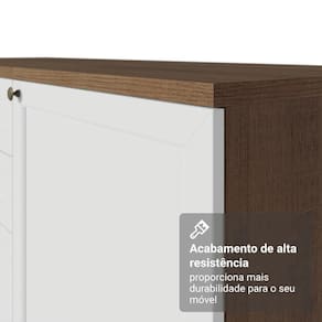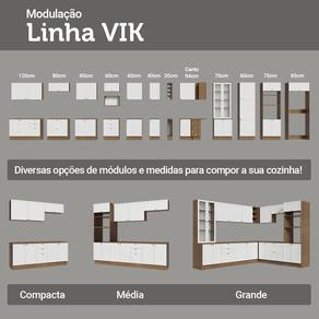 Além disso, a linha Vik é funcional em cada detalhe. As portas possuem dobradiças com amortecimento, garantindo um fechamento suave e silencioso, enquanto as gavetas permitem abertura total, garantindo muito mais facilidade. O acabamento de alta resistência da estrutura é em tom amadeirado Rustic e das frentes em Branco e possui uma textura suave ao toque. O destaque fica por conta dos puxadores ponto em ouro envelhecido, feitos com metal resistente, trazem personalidade e um charme único.