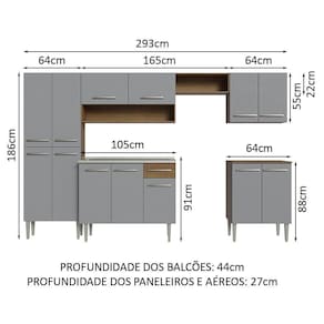 - 44 cm de profundidade nos balcões e 27 cm de profundidade nos aéreos e no paneleiro