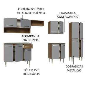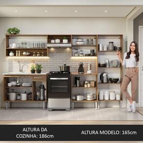 Qualidade acessível: Com excelente custo-benefício, esta cozinha é fabricada com materiais duráveis, garantindo maior vida útil. Possui corrediças e dobradiças metálicas, puxadores de alumínio e pés ajustáveis em PVC.