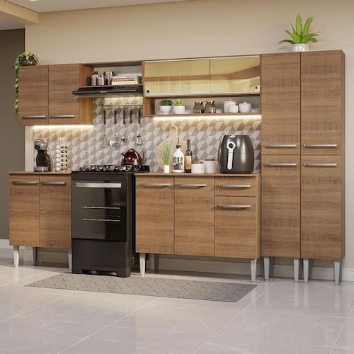 O acabamento da cozinha é no padrão amadeirado Rustic, feito em Pintura Poliéster ecológica com 7 camadas que protegem contra os efeitos da água e do calor.