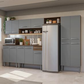 Com módulos avulsos que podem ser organizados de acordo com a necessidade do seu ambiente, ela oferece espaço amplo para guardar utensílios, louças, eletrodomésticos e espaço para acomodar a geladeira, tornando o dia a dia mais prático.