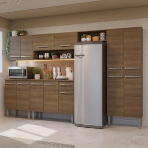 Com módulos avulsos que podem ser organizados de acordo com a necessidade do seu ambiente, ela oferece espaço amplo para guardar utensílios, louças, eletrodomésticos e acomodar a geladeira, tornando o dia a dia mais prático.