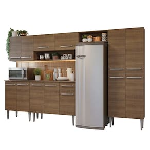 A linha Emilly se destaca pelo acabamento de alta resistência, puxadores em alumínio, corrediças e dobradiças metálicas, garantindo durabilidade no uso diário. Os pés reguláveis proporcionam estabilidade e facilitam a limpeza. Sua cozinha ganha um visual acolhedor e contemporâneo com o acabamento em tom amadeirado Rustic.