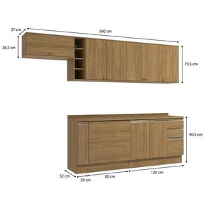 Remetendo aos tons da natureza, você terá o espaço ideal para armazenar seus itens e preparar suas receitas com praticidade. Completo e muito funcional, perfeito para todos os espaços, o combo une três balcões, com 20cm, sendo o módulo porta-tempero, o balcão para forno de embutir, de 80cm e o balcão de pia, além dos aéreos nas mesmas medidas e um basculante, uma composição versátil e indispensável para quem procura por funcionalidade.