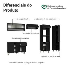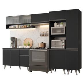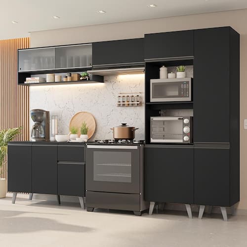 O acabamento de alta resistência no tom preto garante um visual moderno e sofisticado à cozinha. Os puxadores em cinza titanium valorizam ainda mais o ambiente,